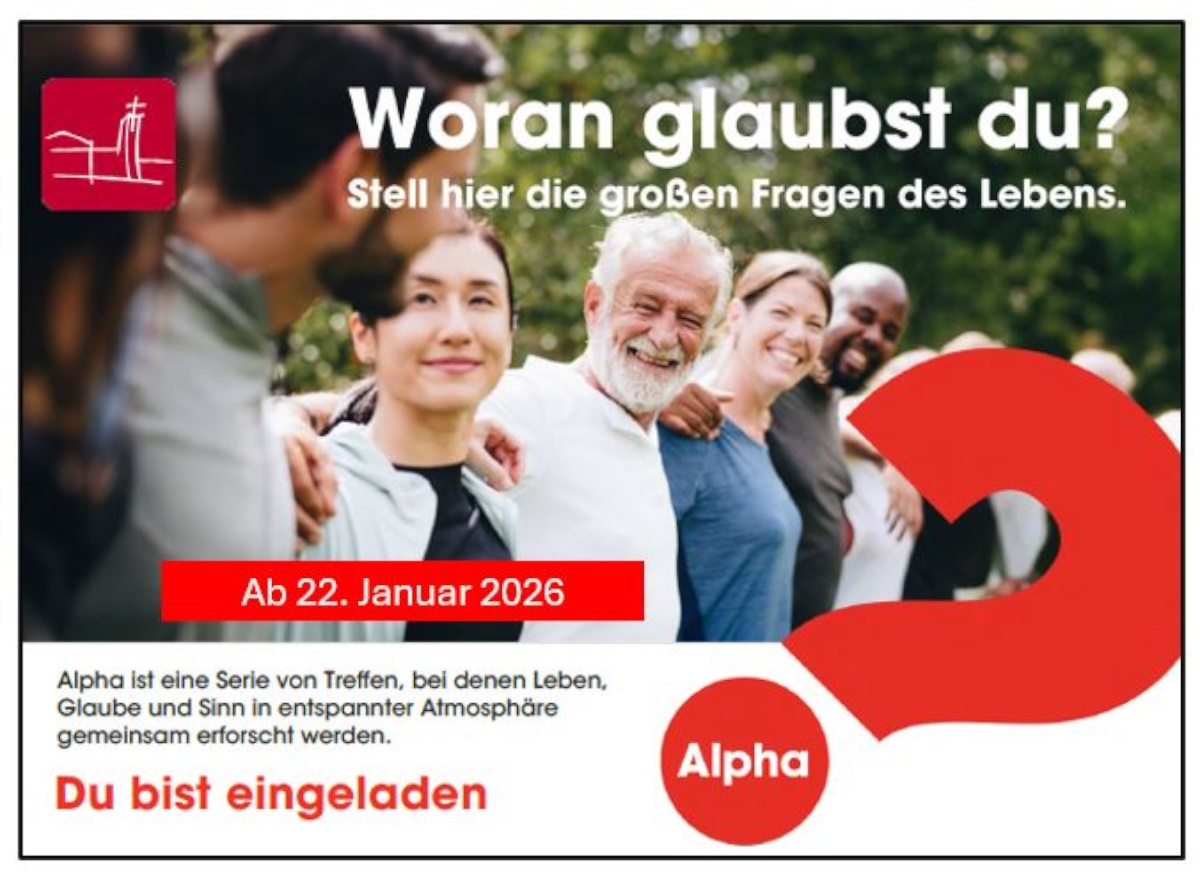 Woran glaubst du? Stellt hier die großen Fragen des Lebens. Der Alpha-Kurs startet endlich wieder. Jeder Mensch hat Fragen. Jeder Mensch sollte die Möglichkeit bekommen, diese Fragen zu stellen, seine Meinung zu sagen und Glauben zu entdecken. Alpha ist eine Reihe von Treffen, bei denen der christliche Glaube in entspannter Atmosphäre entdeckt werden kann.