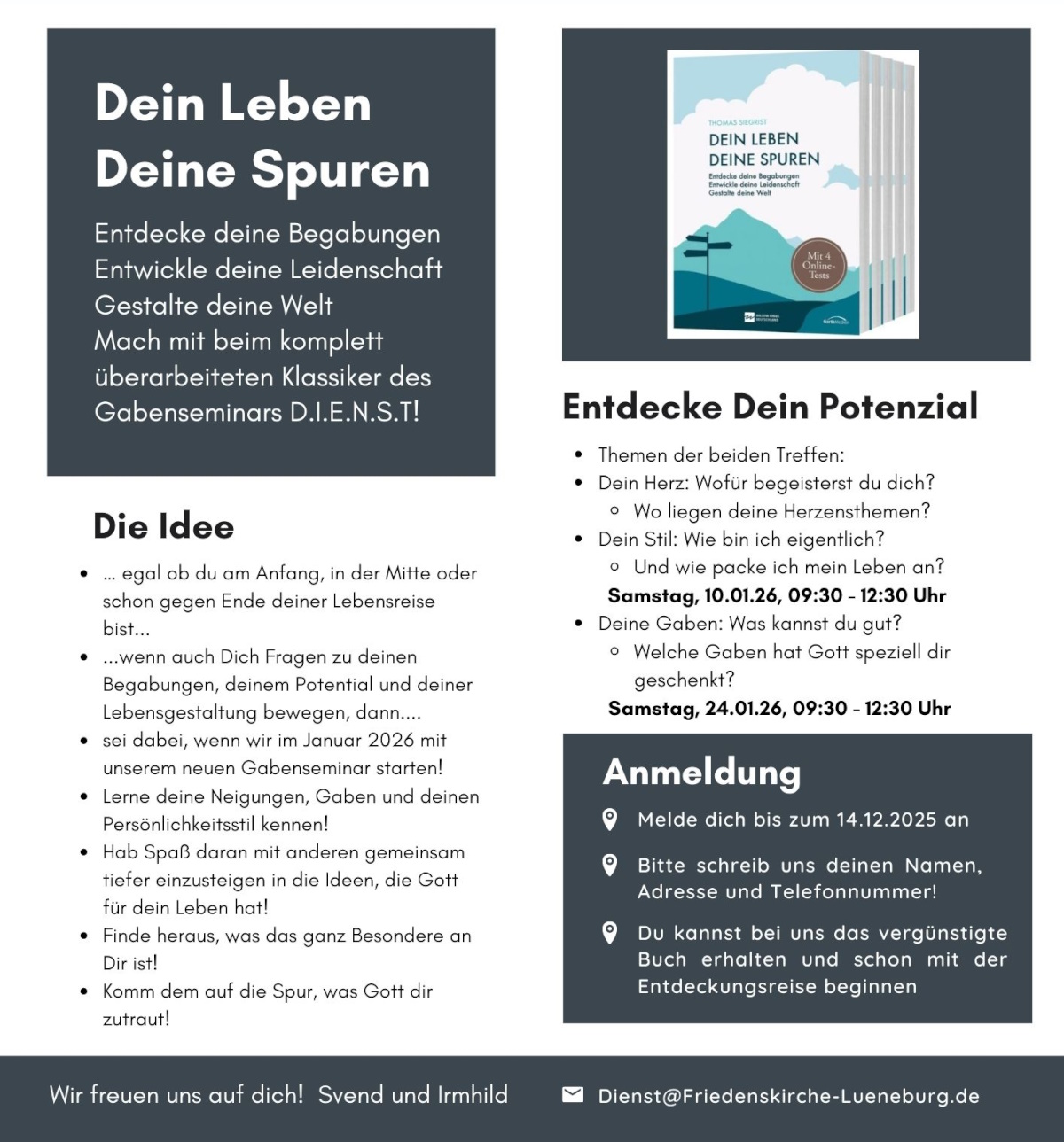 Herzliche Einladung zum neuen Gabenseminar „Dein Leben – Deine Spuren“ – um Anmeldung wird bis zum 14.12.25 gebeten.