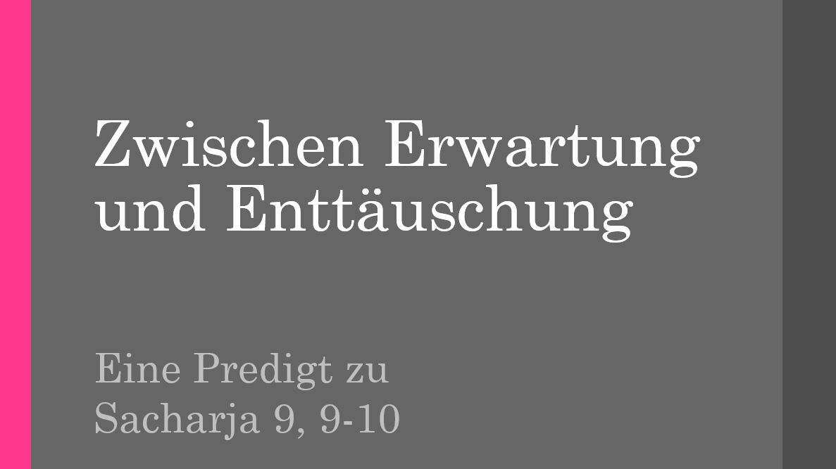 Herzlich Willkommen zu unserem Gottesdienst zum 2. Advent. Unser Pastor Christoph Petersen wird zum Thema „Zwischen Erwartung und Enttäuschung“ mit der Bibelstelle aus Sacharja 9, 9-10 predigen. Rainer Wiegel wird den Gottesdienst leiten, der um 10.00 Uhr beginnt.